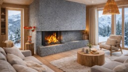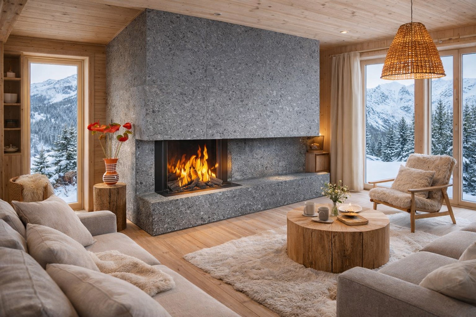 Barbas Panorama kommer 6 størrelser. Peisen blir levert med sort matt bakvegg, brede rammer og naturfarget eller sort ved. Her vil bålet være blikkfanget, det er nært og realistisk.