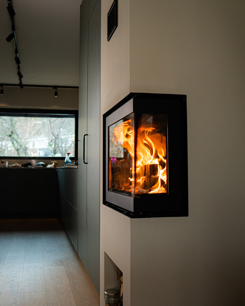 Takket være det minimalistiske designet med to siders glass uten stålkanter, får du full oversikt over flammene, noe som skaper en varm og innbydende atmosfære i stuen, hytta eller vinterhagen.