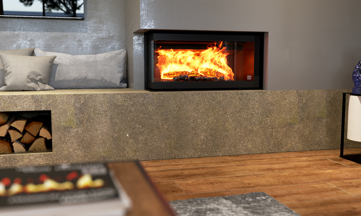 Venus peisinnsats fra M-Design er et moderne vedfyrt ildsted! Velg mellom høyre eller venstre hjørne. Den har lav høyde over glasset, noe som gjør at den krever mindre plass ved innebygging. Venus passer utmerket i eksisterende gruver eller som en oppgradering av gamle peisinnsatser. Den sidehengslede døren (uten hev & senk) gjør bruk og vedpåfylling enkelt og praktisk, samtidig som designet holder fokus på flammene og den naturlige varmen fra peisen.